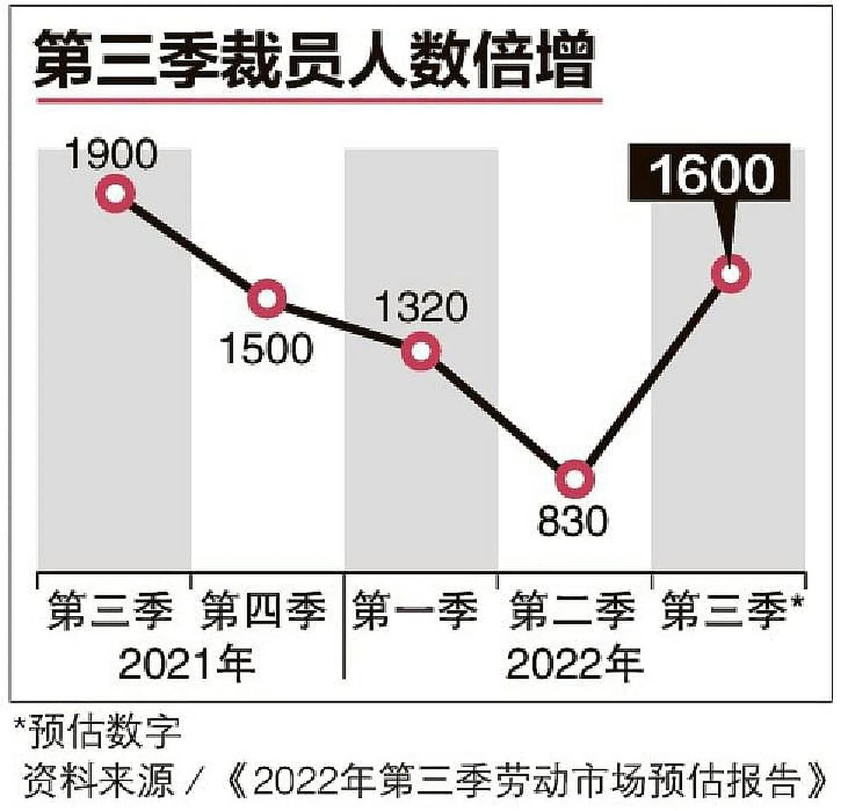 本地第三季度被裁退人数跟第二季度相比,估计翻倍至1600人,其中1100人之前从事服务业,被裁的主要原因是企业业务重组,另外500人来自制造业,主要因为产品线停产。