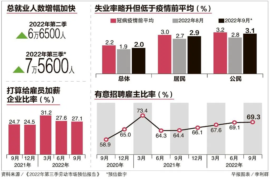 人力部指出,第三季度就业出现增长的主要原因是从事建筑业和制造业的非居民人数回弹。不过,随着经济增长放缓,现在已经有早期迹象显示劳动市场改善的势头会减弱,接下来几个月全球经济环境变得糟糕、全球通货膨胀高企以及地缘政治的紧张局势,劳动市场会遭遇冲击。
