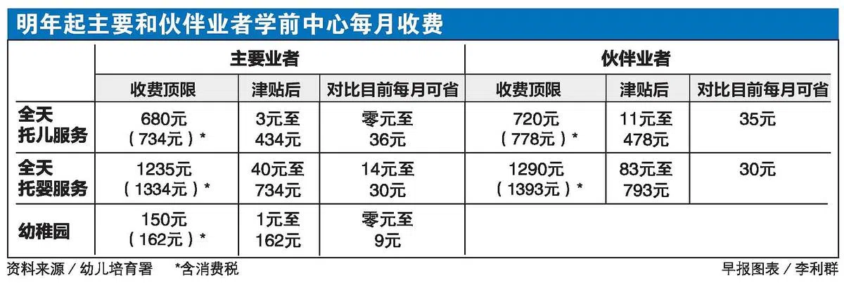 明年1月1日起,主要业者和伙伴业者学前教育中心的全日制托儿和托婴服务,每月收费顶限皆降低40元;主要业者经营的幼稚园,每月收费顶限则降低10元。约10万名公民幼童的家长可支付更低廉的费用。