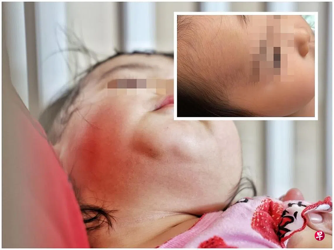 20个月大女童被送到学前教育中心,短短一个月内,额头、大腿内侧和下巴多处出现淤青,父母报警追究,中心负责人说,将交当局调查。