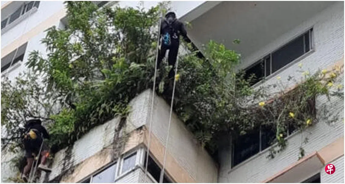 该座组屋一共有16楼,苏先生透露,星期二(11月1日)上午11时许,看见当局人员到场,从楼顶吊钢索到九楼单位的外墙,清除“小树林”。