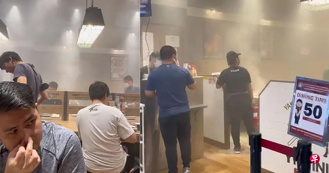 有网民拍下视频并上传到社交媒体TikTok。画面显示,餐厅当时烟雾弥漫,其中一个顾客的烤炉不停地冒出白烟,店内有不少顾客在用餐,但白烟笼罩整个餐厅,顾客开始掩鼻离开。
