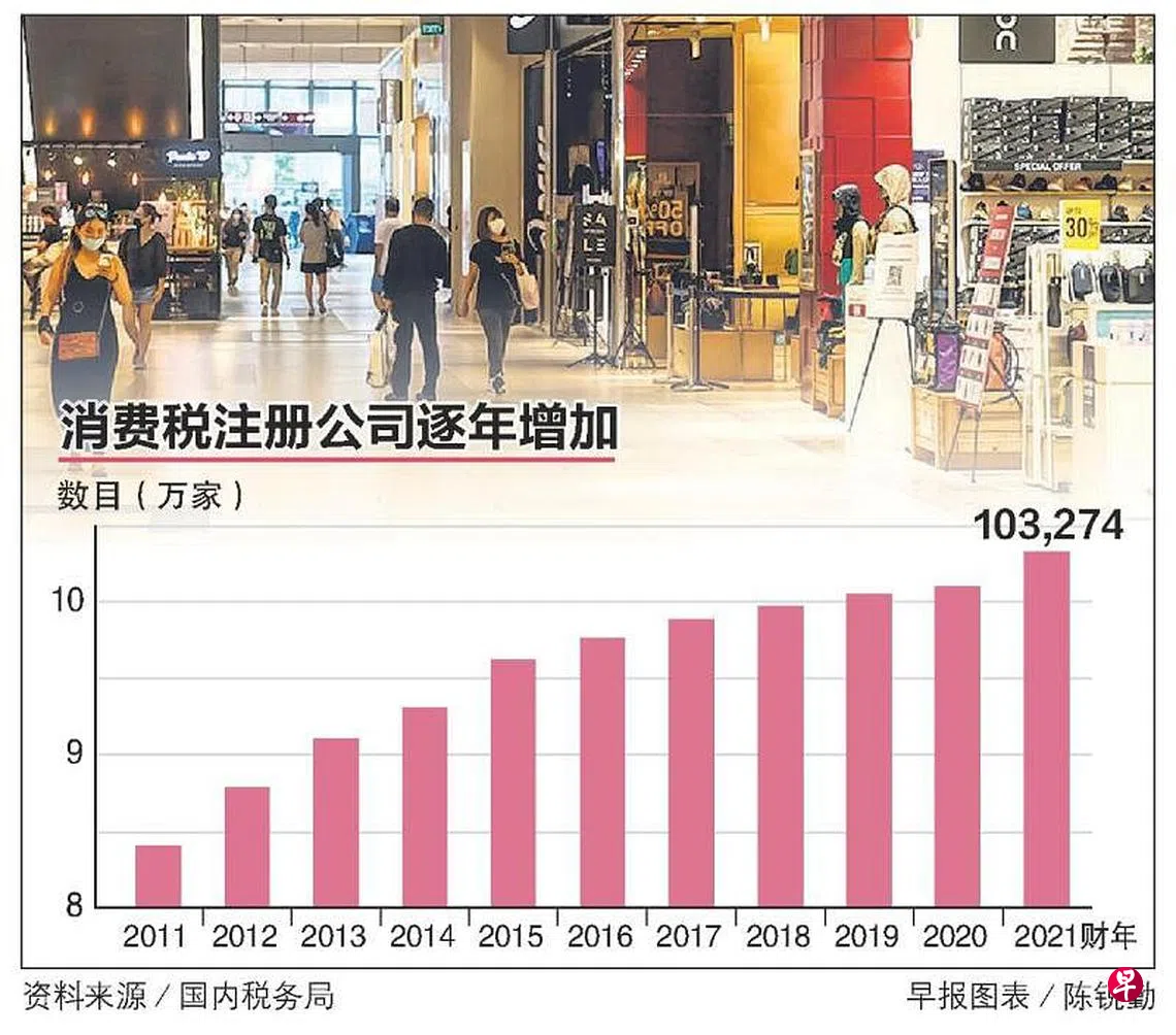 根据国内税务局提供给《联合早报》的数据,消费税注册企业的数目过去10年逐年增加,从2011财年的8万4090家,提高至2021财年的10万3274家。当中约4万1000家是首次面对消费税率调整。