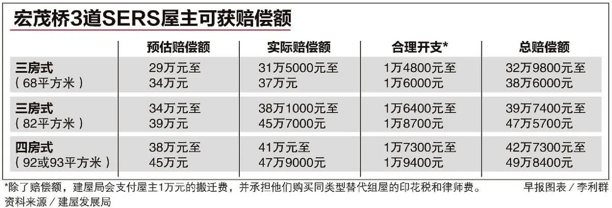 三房式组屋面积若是68平方米,实际赔偿额介于31万5000元至37万元,面积82平方米的赔偿额介于38万1000元至45万7000元;面积92或93平方米的四房式介于41万元至47万9000元。