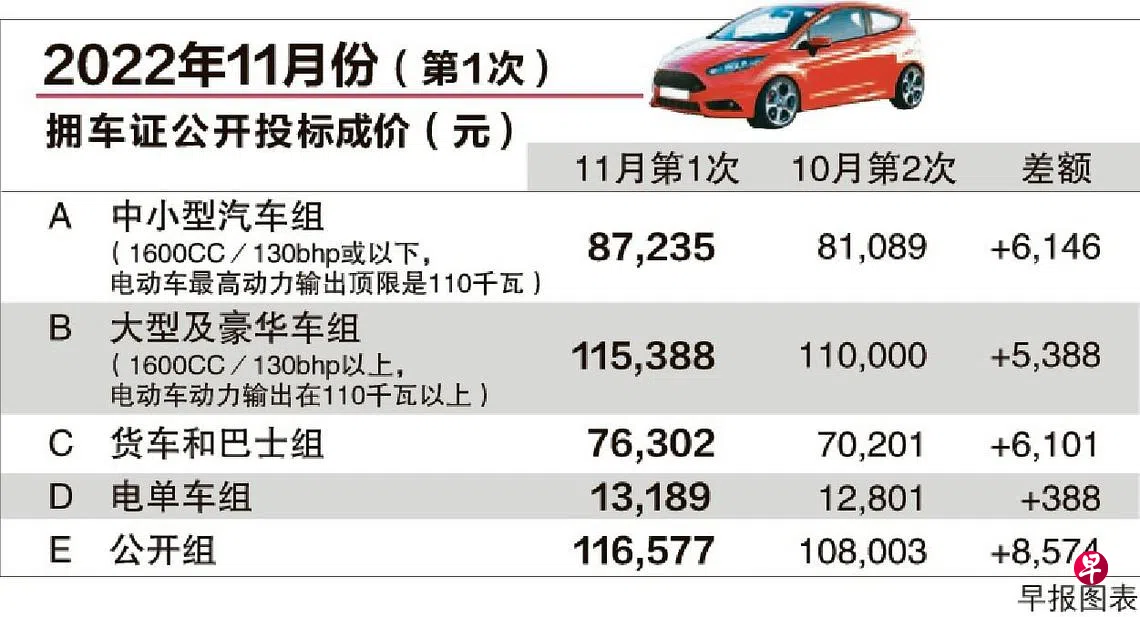 11月第一轮拥车证公开投标活动,是陆交局把今年11月至明年1月拥车证配额数量,整体减少13.7%后的第一轮投标活动。所有车组的拥车证成价全面上扬,三个组别创新高,其中大型及豪华车组成价攀升至11万5388元;公开组成价超过11万6500元。