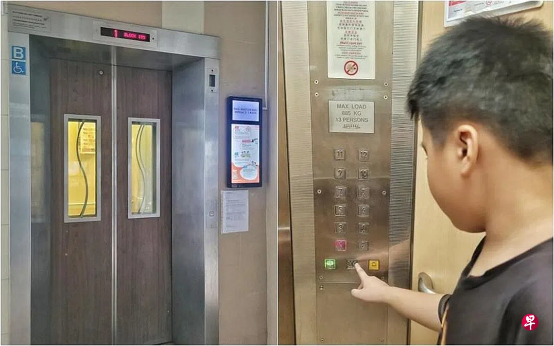 《新明日报》星期三收到读者通报及事发时的视频,画面可见一名男童被困在电梯里无法出来,他手里抱着一粒篮球,神情慌张、泪眼汪汪,不到几秒钟,电梯就往上升,男童则向在电梯外的民众挥手、比“赞”,示意自己无碍。