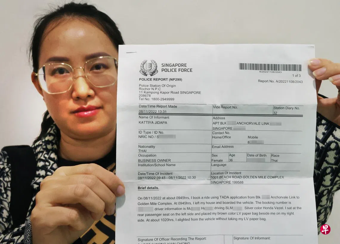 在黄金坊经营名牌商品店的泰裔女老板吉达帕卡提亚(Jidapa Kattiya,36岁)接受《新明日报》访时说,当时她从盛港搭私召车到黄金坊,下车不久才发现带着的购物袋不见了。她说,购物袋里装有3万元现金、一对LV耳环等。“当天我下车时碰到朋友,跟她聊了几句话,所以没发现东西留在车上。”