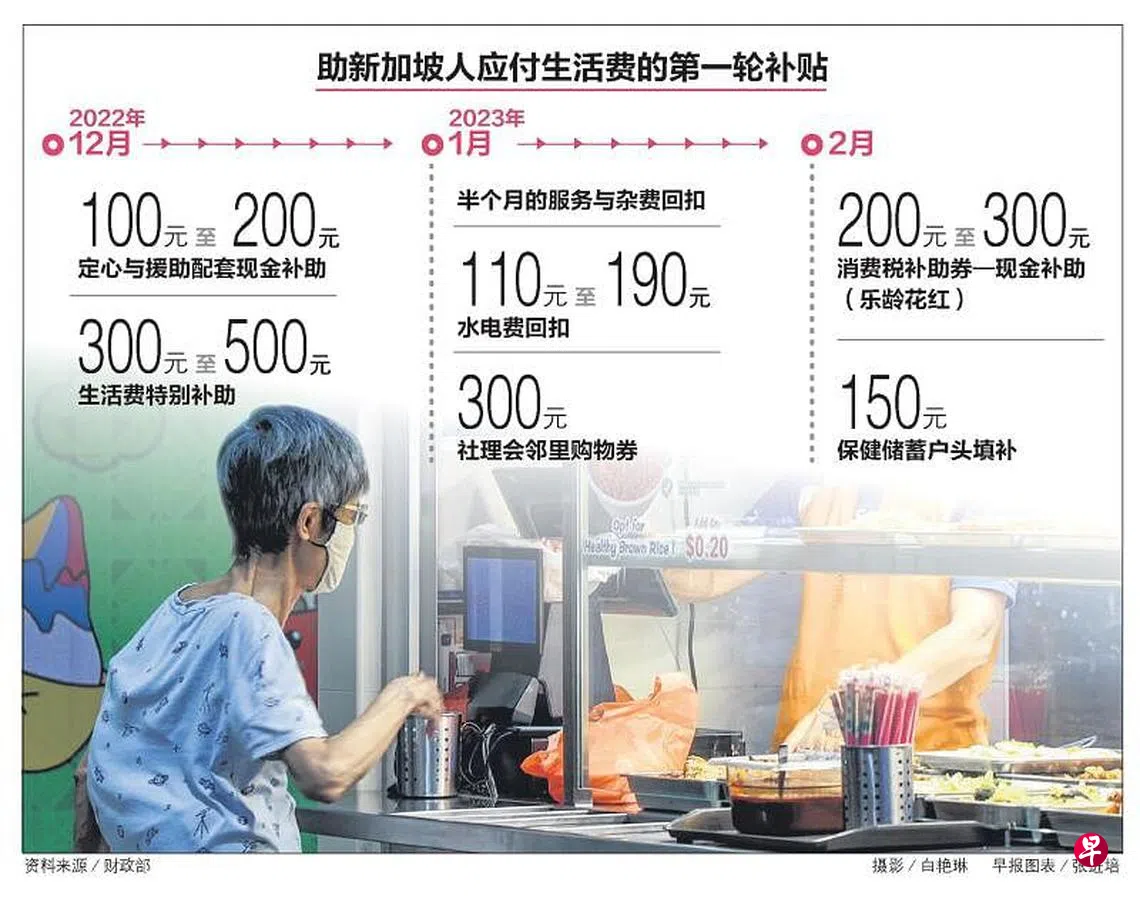 为减轻消费税调高的影响和帮助新加坡人应付生活费,政府今年12月发放两笔补助金。约290万人可获高达200元的定心与援助配套现金补助,约250万人也可获高达500元的生活费特别补助。