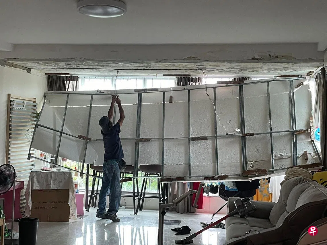 三米长的假天花板砸下,吓坏一家四口,女住户接受《新明日报》访时说,庆幸当时孩子不在客厅玩闹。