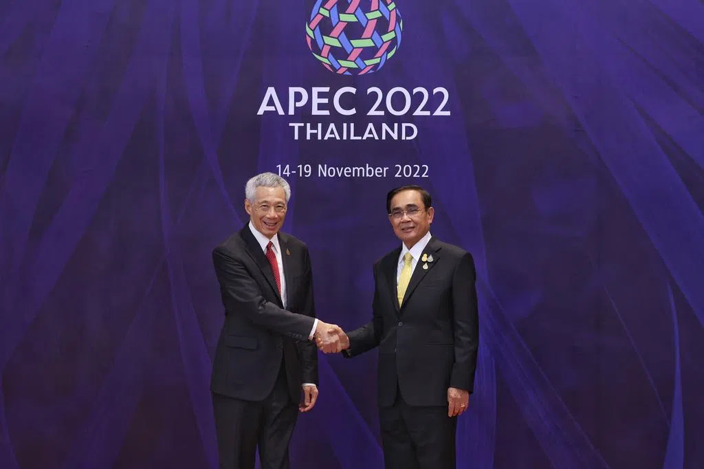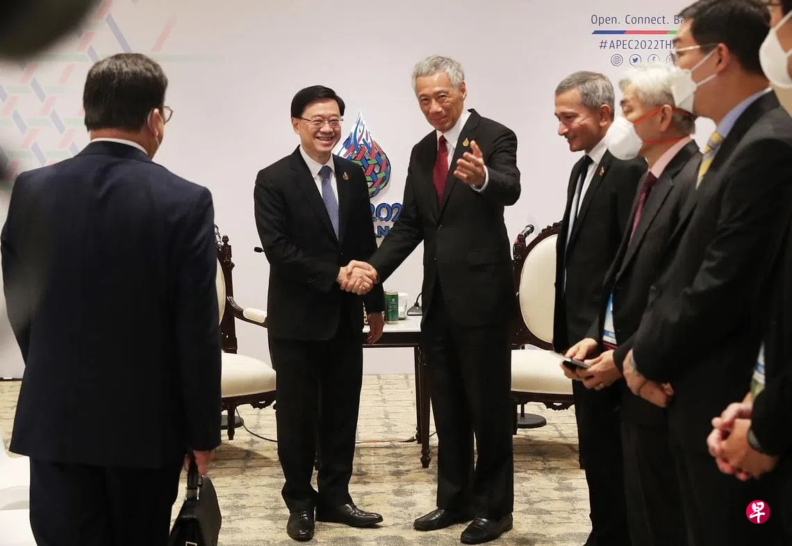 李显龙总理(左三)与香港特首李家超(左二)星期五(11月18日)下午在泰国曼谷的亚太经济合作组织(APEC)经济领导人会议场边会面,重申新加坡与香港密切和持久的合作关系。这是两位领导人首次会晤。
