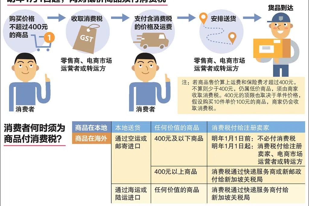 消费税将由已注册消费税的卖家、电商市场运营者或转运方收取,从海外网购低价商品的消费者一旦向其中一方支付消费税,将不需要向其他业者重复支付。同时,消费者付款的金额如果已经含税,也无需额外付消费税给新加坡关税局。