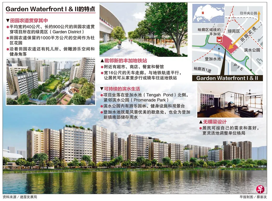 Garden Waterfront I & II由18座组屋组成,楼高介于九层至16层,提供二房式灵活至五房式单位。Garden Waterfront I也会有一些租赁组屋。