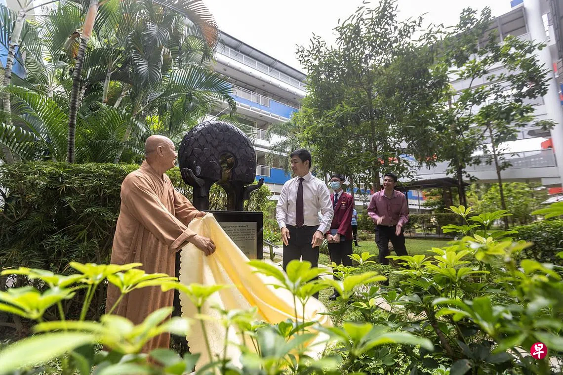 新加坡文殊中学(Manjusri Secondary School)11月18日庆祝建校40周年,佛教总会以四座紫铜雕像为贺礼,并邀得国会议长陈川仁主持揭幕仪式。