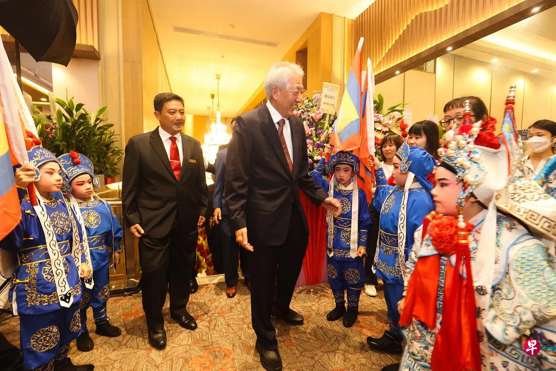 国务资政兼国家安全统筹部长张志贤(中)星期三(11月23日)以主宾身份在醉花林俱乐部出席新加坡张氏总会85周年暨清河张氏公会67周年双庆大典并致辞时说,新加坡过去几年面临疫情等挑战,张氏总会做出很多贡献,帮助会员和新加坡人应对疫情。