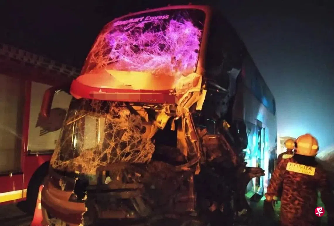 一辆从本地出发的长途巴士,在马来西亚南北大道与罗厘相撞,导致16名乘客受伤,其中一名新加坡籍乘客因头部受轻伤而送院治疗。