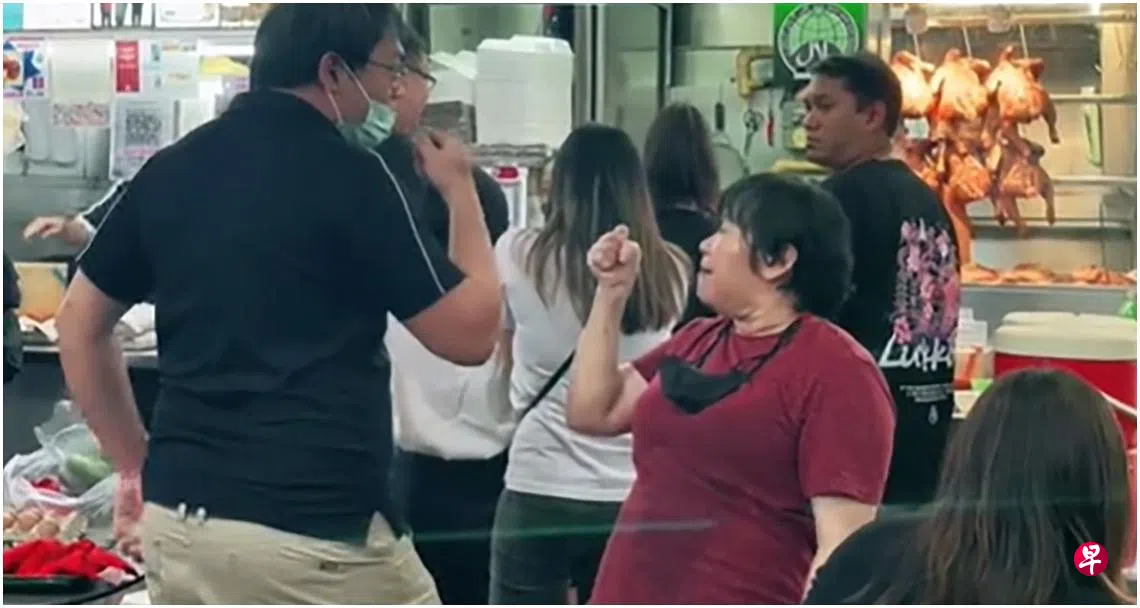 一段相关视频之后在网上流传,一对60来岁的阿叔阿嫂在跟一名身穿黑衣的男食客争吵。男食客当时在排队买鸡饭,阿叔阿嫂则是隔壁菜饭摊位的小贩。