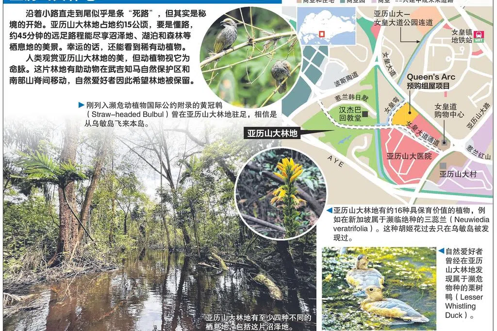 林地清除容易,修复难,好比搭建方舟,须要投入大量时间和精力。自然爱好者深知这点,因此吁请政府保留亚历山大林地,保护林地内的丰富自然生态,重新考虑发展这个地段的计划。他们提出了一些保育这片林地的建议,包括修复附近亚历山大医院的蝴蝶园、把沿着亚逸拉惹快速公路(AYE)的空旷草坪打造成缓冲区、建造一个横跨AYE的生态连道协助动物在不同栖息地之间行走等。(李冠卫摄)