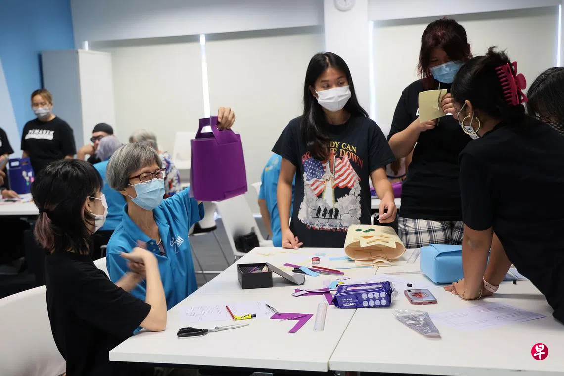 把裁剪好的布料拼接在一起,并黏上花儿形状的小饰品点缀,15名视障人士参与“无针线购物袋”工作坊,在淡马锡理工的学生的协助下,合力完成了实用又不失童趣的购物袋。