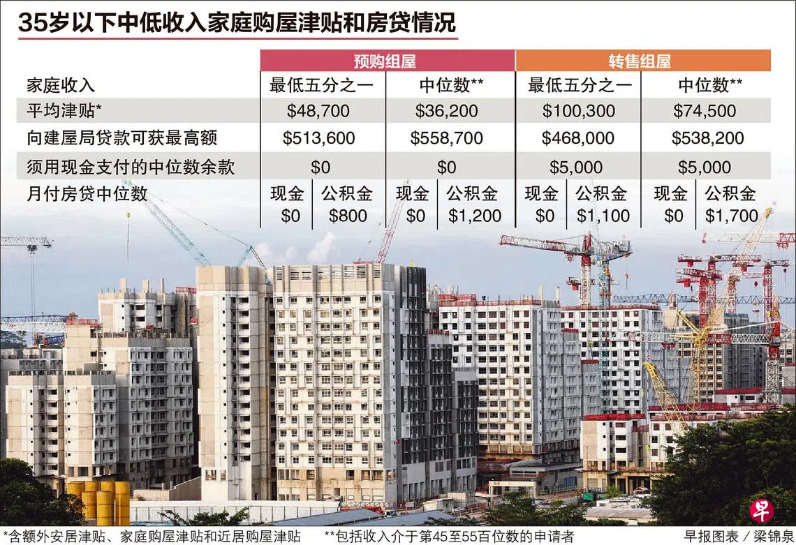 35岁以下、家庭收入属于最低五分之一水平的买家在购买预购组屋时,平均获得4万8700元的购屋津贴。他们在购买转售组屋时,则平均获得10万零300元的津贴。这些家庭中,至少一半支付每月房贷不须掏现款,只用公积金。
