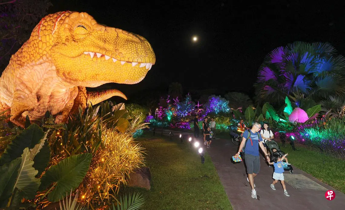 蒲公英、姜饼人、水母还有蘑菇造型的彩色灯饰,将夜色点缀得更璀璨迷人,周围还有巨型恐龙的陪伴,让公众仿佛置身魔幻世界。
