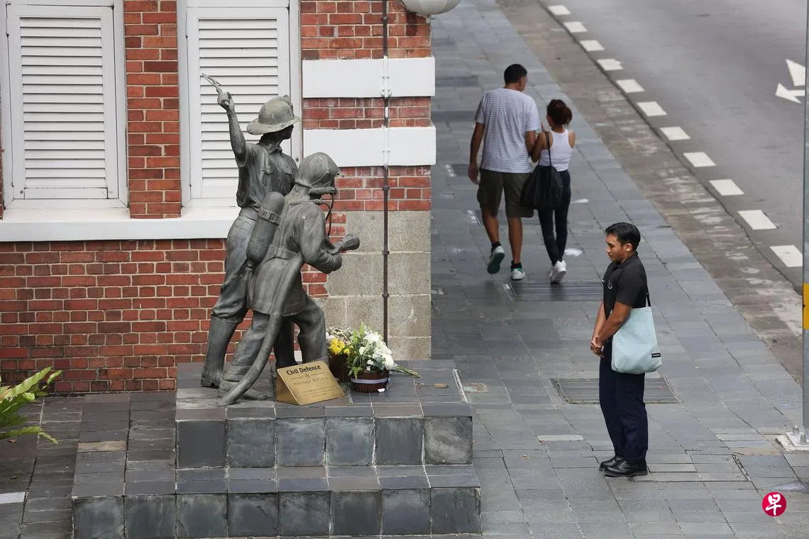 不少消防员也从旁边的中央消防局,身着制服到雕塑前伫立默哀。约一分钟后,再折返消防局,全程大家不发一言,神情肃穆庄重。