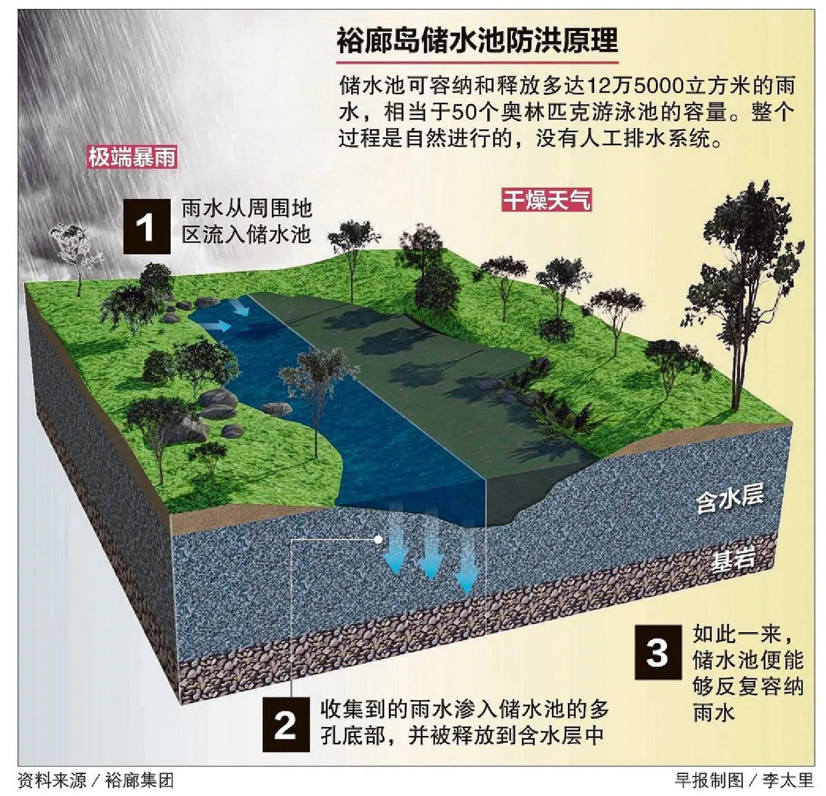 为加强防洪能力应对极端暴雨,裕廊岛增建可容纳12万5000立方米雨水的储水池,相当于50个奥林匹克游泳池的容量,是本地首创。