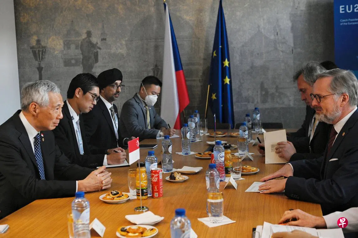 据总理新闻秘书发布的消息,李总理(左一)与欧盟轮值主席、捷克总理菲亚拉(Petr Fiala,右一)会晤时,李总理祝贺捷克今年7月至12月的主席任期取得成功。