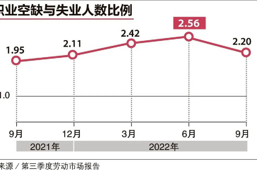 职位空缺总数连续第二个季度下降,从6月的12万6100个减少到9月的10万8200个。职位空缺与失业人数的比例因此从2.52下降至2.20,也就是每一名失业者就有2.20个职缺。这些职缺主要来自制造和建筑业、资讯与通信、金融服务、专业服务及卫生与社会服务领域。
