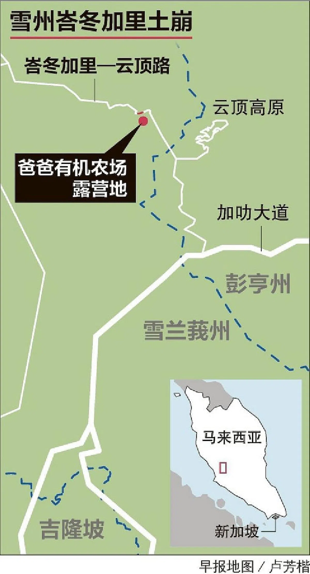 云顶半山土崩在凌晨2时许发生,地点是雪兰莪州峇冬加里(Batang Kali)“爸爸有机农场”(Father's Organic Farm)附近露营地。