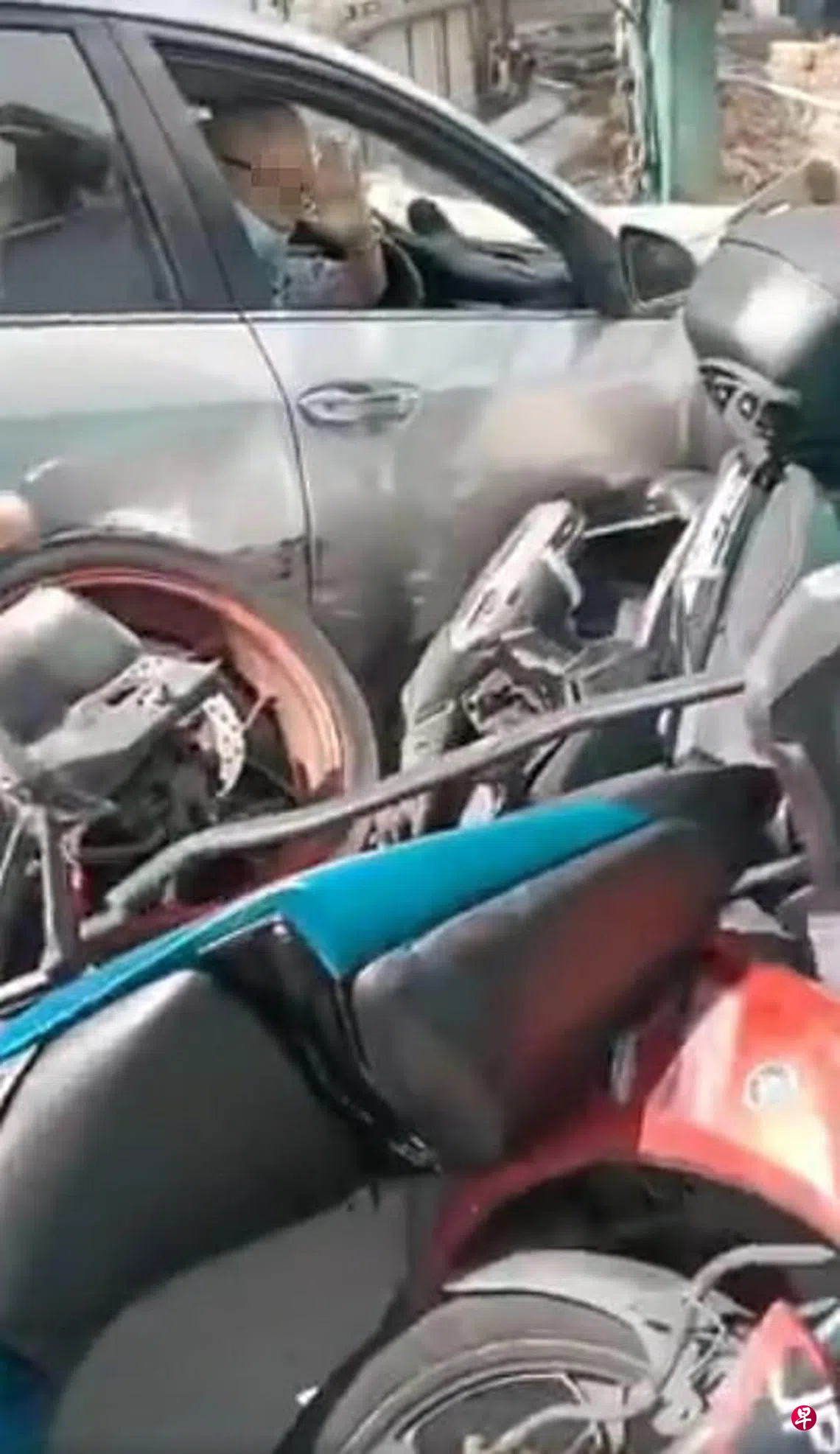疑似刹车失灵,轿车撞倒一排电单车,冲上路堤,再撞入施工工地,八旬老翁送院。