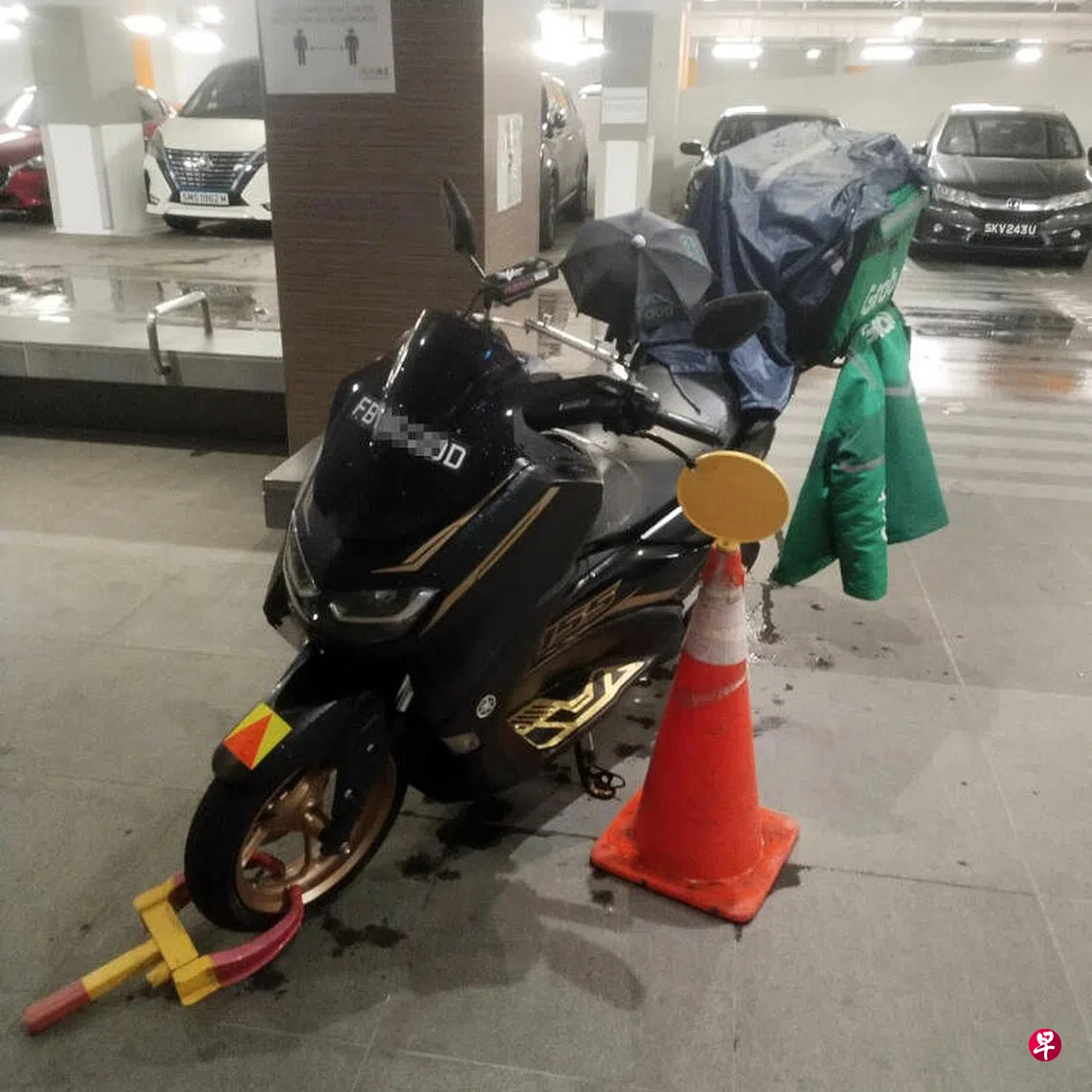 颜焕斌把电单车停放在靠近住宅大楼电梯入口处附近,拎着食物走向单位,没想到短短两分钟的时间,当他返回停车场,就看见保安人员正在锁轮。