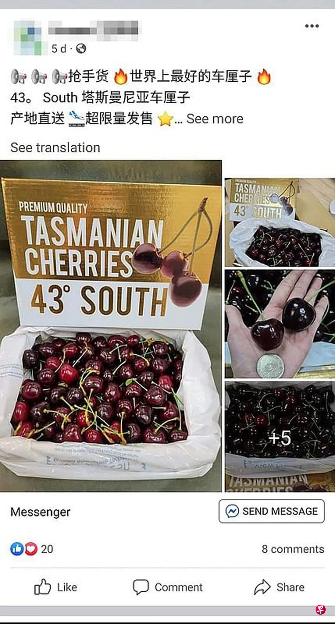 她在脸书上发短信给卖家后买了三公斤樱桃,然后用PayNow付了150元。