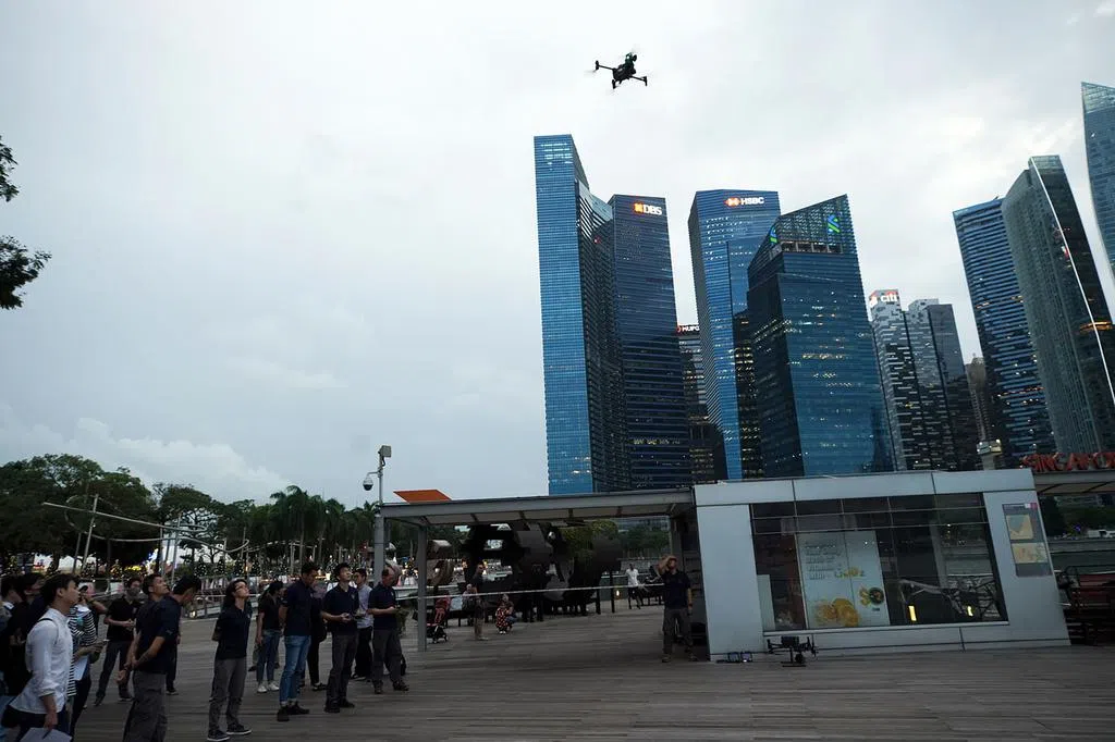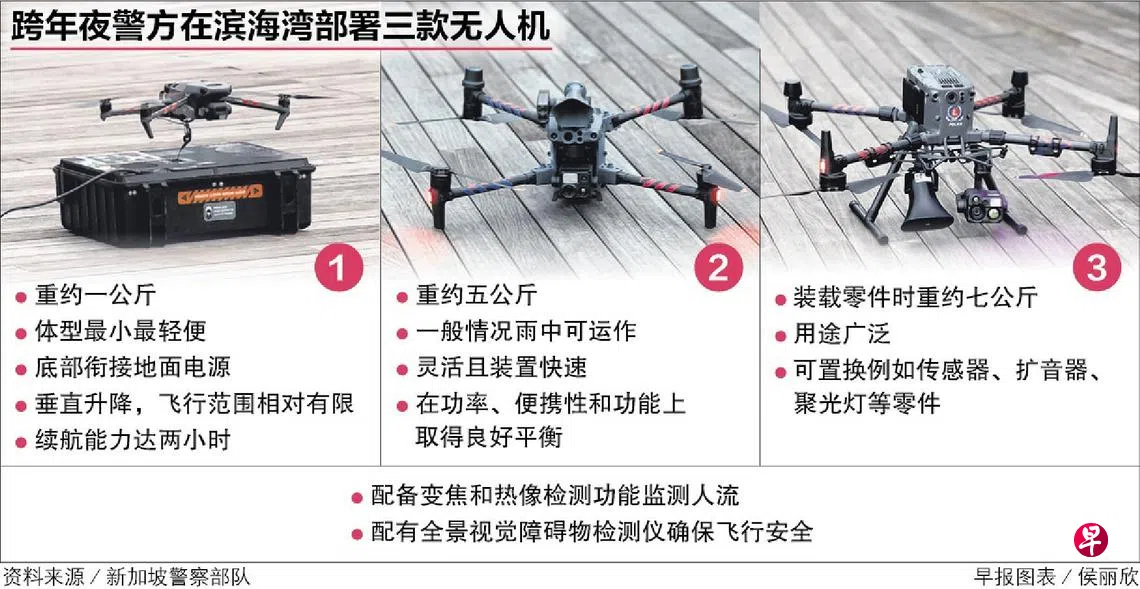 配合2023年元旦倒数活动,警方首次出动三款不同功能的无人机,在滨海湾上空监测人群,必要时可通过装配在无人机上的聚光灯、警报器和扩音器提醒民众注意。