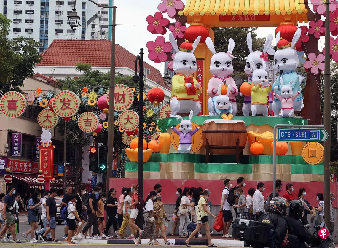 陈金香(67岁,家庭主妇)星期五到牛车水逛街,准备买新衣过年。她说:“今年的灯饰造景有很多细节,有房子,有花朵,而且兔子的表情挺生动,也比较精致,不像往年那么粗糙。”