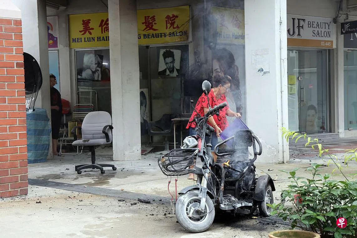 裕廊东一间美发院前的行动辅助工具失火,公众见状用灭火器把火扑灭,避免火势蔓延。