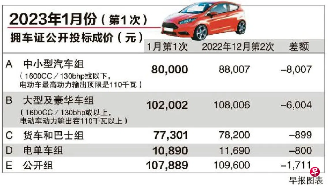2023年第一轮拥车证公开投标活动星期四(1月5日)下午结束,供应大众市场的中小型汽车组(A组)报8万元,下滑8007元(9.1%),是两年多来减幅最大的一次。
