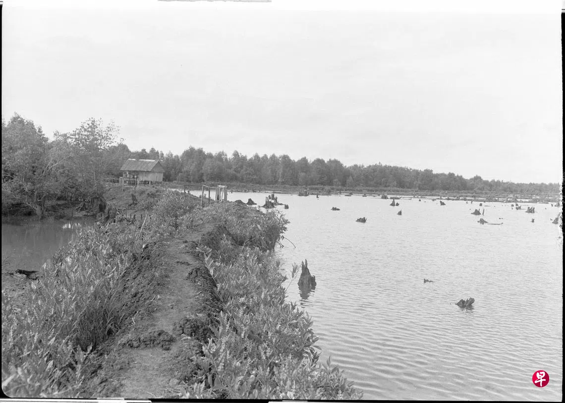 养虾业1950年代达到高峰,最多时总面积超过800公顷。西海岸一带是拥有最多虾池的地区之一。不过,到了1980年代,因为政府在海岸线的填海工程,虾池逐渐消失。图为1950年代我国西南部巴西班让乡村的一个虾池。