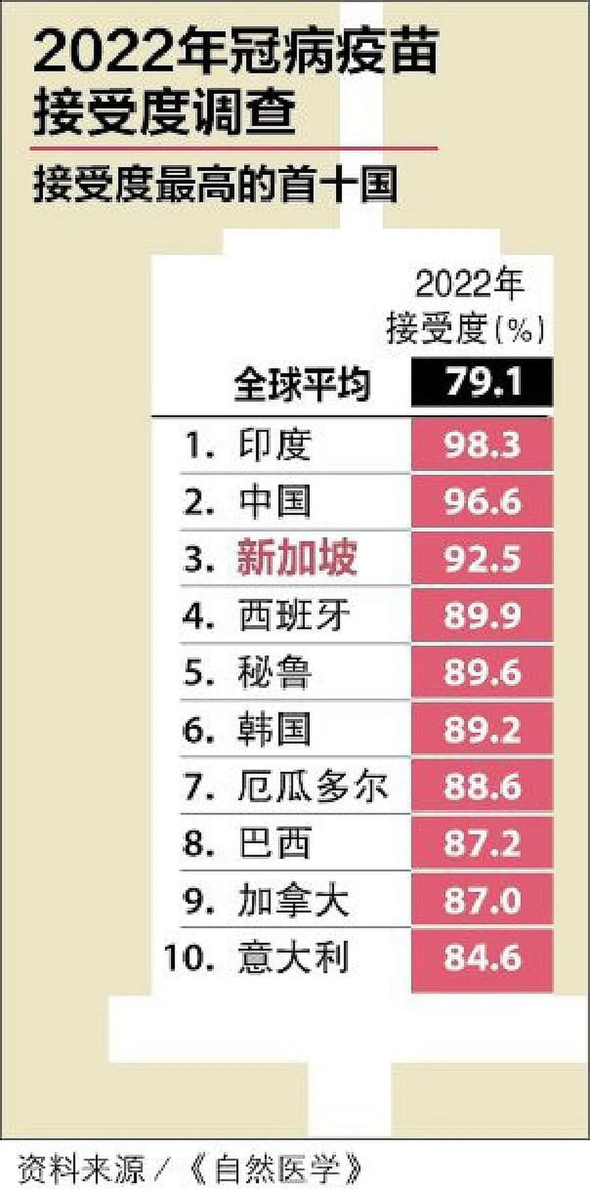 一项国际研究调查显示,新加坡人对冠病疫苗的接受度高达92.5%,高于全球的平均数,在23个国家中排第三,仅次于印度和中国。印度的接受度是98.3%,中国为96.6%。