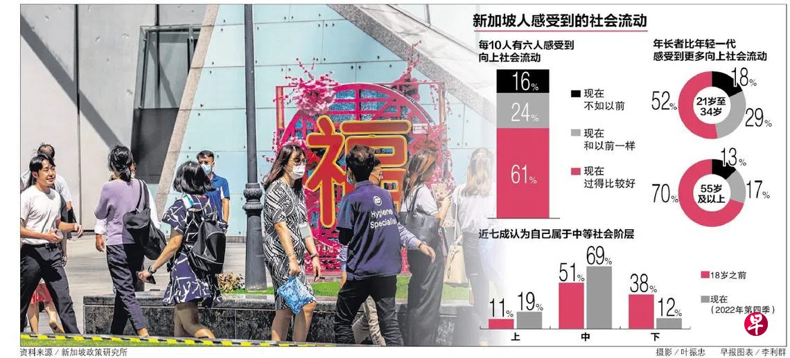 新加坡政策研究所的调查显示,大多数受访者认为现在的生活比青少年时期更好,六成人感觉到自己向上提升,较年长受访者体验到的社会流动也更为明显。