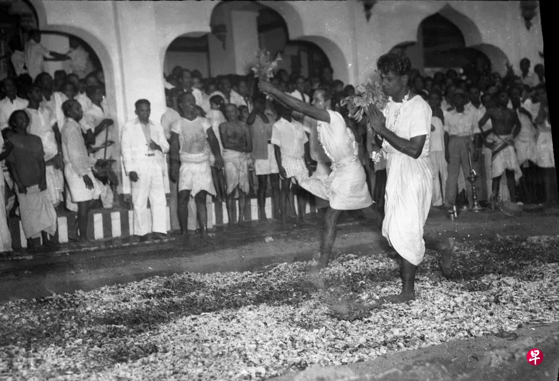 蹈火节纪念的是印度史诗《摩诃婆罗多》(Mahabharata)里的一位女神蒂劳柏地(Draupadai)。图为1950年的马里安曼印度庙,印度教徒手握被认为能驱邪避凶的苦楝树叶,赤脚踩过火炭堆,表达对神明的虔诚之心。此情此景,如今每年10月或11月蹈火节当天,仍会在马里安曼兴都庙上演。