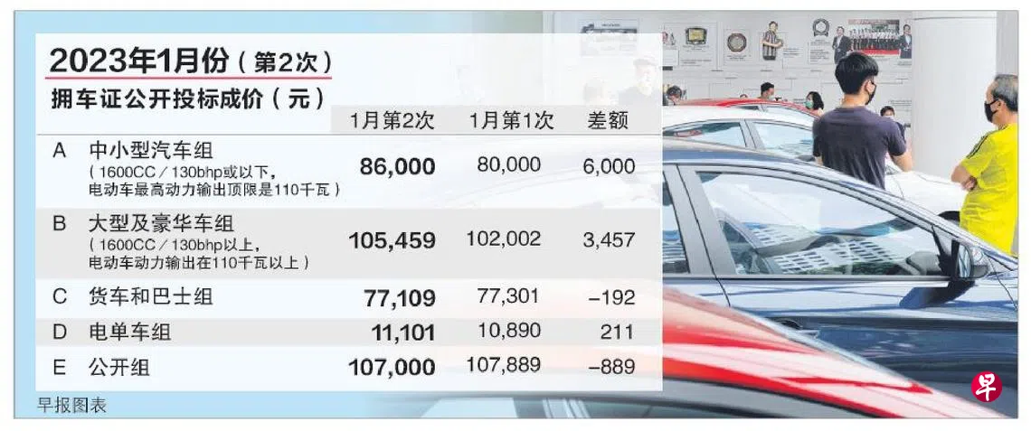 本月第二轮拥车证公开投标活动星期三(1月18日)结束,应付大众市场需求的中小型汽车(A组)成价上涨6000元(7.5%),报8万6000元。A组成价在本月初猛跌了8000多元,是两年多来减幅最大的一次。