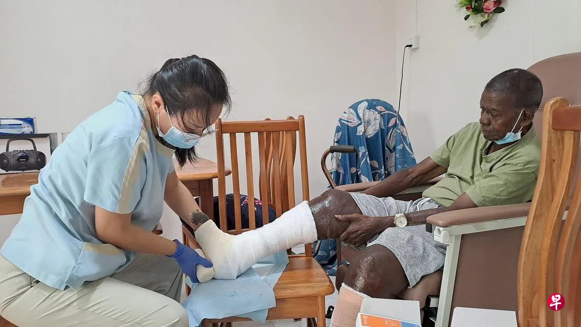 患有下肢静脉溃疡或俗称“老烂腿”的患者,每周都要前往医院清洗伤口和更换绷带。为了方便患者,新加坡中央医院与非盈利医疗组织家护基金合作,培训社区护士上门服务,让患者免去舟车劳顿,也节省金钱和时间。