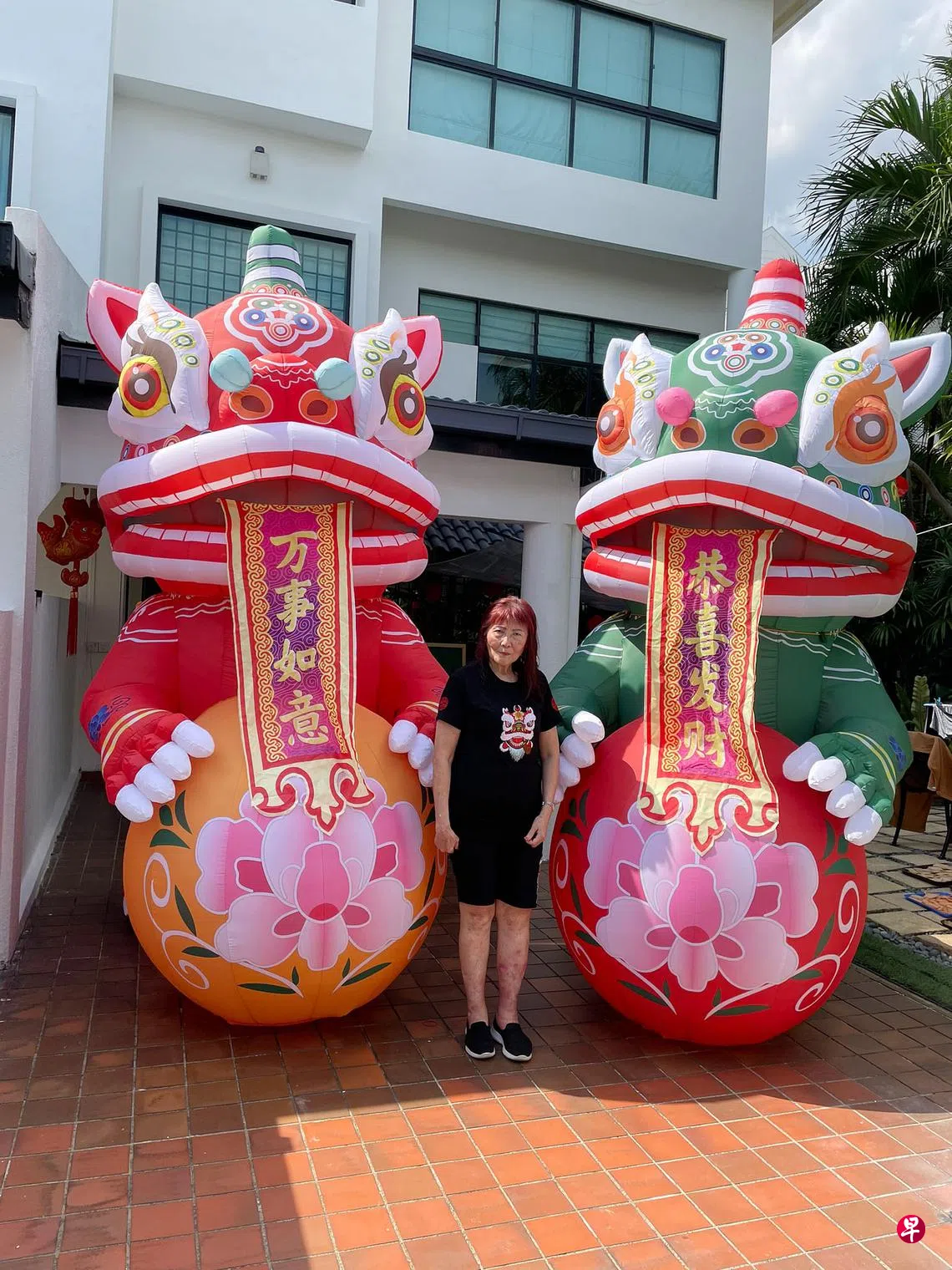 这对三米高的充气模型,只需短短几分钟就能充好气。女屋主王美莉(72岁,五金店老板)说,大年初一来家里拜年的访客前后加起来有数十人,希望可爱的瑞狮模型能给访客带来欢乐,度过美好的时光。