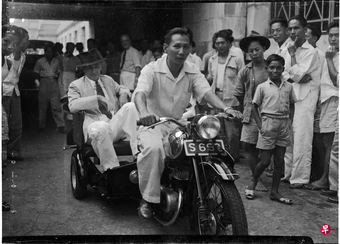 由于担心安全问题,摩托三轮车须经过市政局委员会和车辆注册官的再三检验,才能获准在市场上出售。图为1950年9月1日市政局代理主席麦尼斯氏(T.P.F. McNeice)第一次试坐摩托三轮车。当时本地出现的第一批摩托车,皆由李玉荣汽车公司向捷克购入,售价每辆约1500元,正式出售前还在快乐世界向观众进行了为期一周的展览。