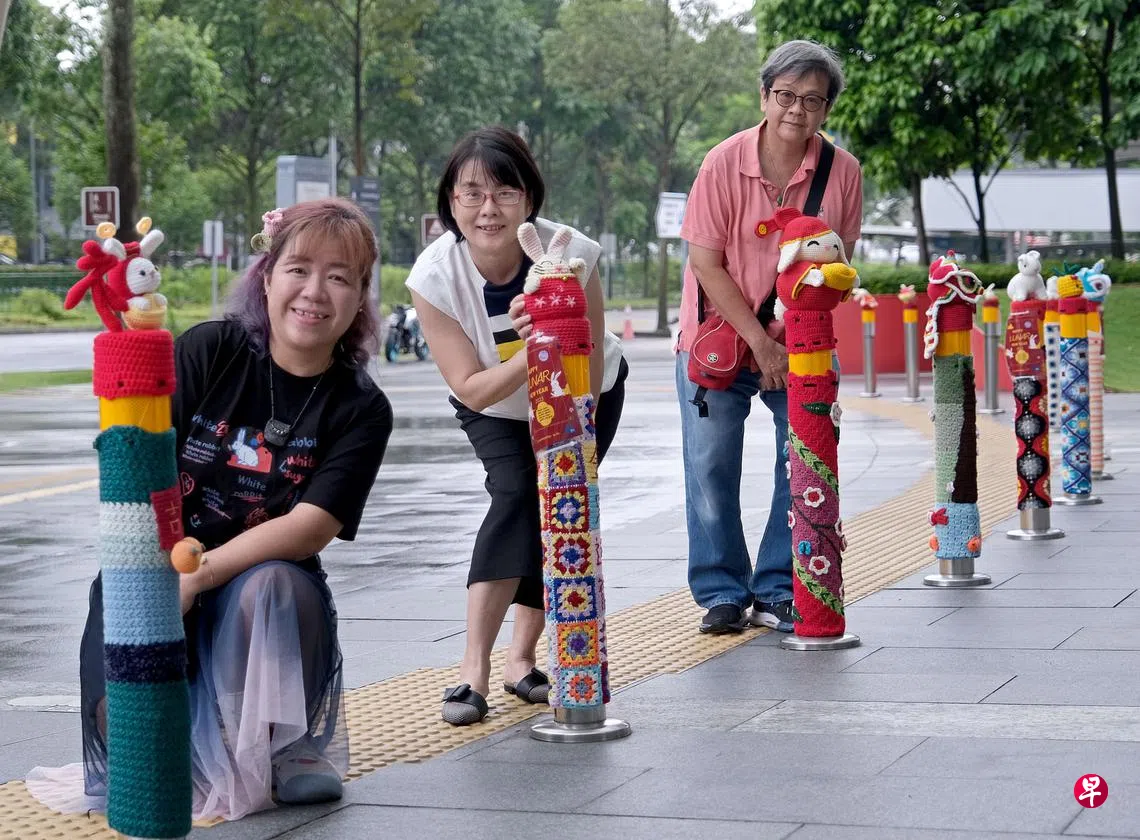 纬壹科技城(one-north)的启汇城(Fusionpolis)门外,每个农历新年前后都会出现以农历新年为主题的钩针装置作品。今年,一只又一只造型各异的小白兔、舞狮等吉祥动物为启汇城的防撞柱添上浓浓的佳节气氛。