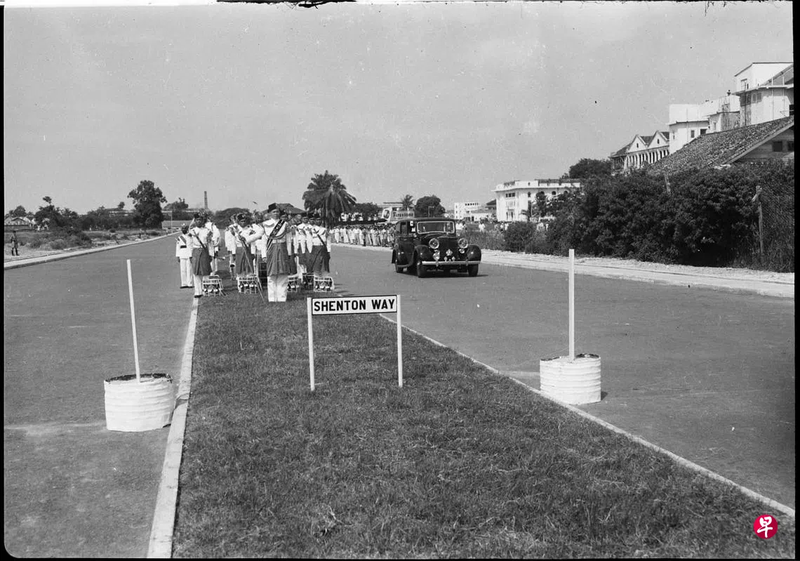 为了铭记珊顿·托马斯爵士的事迹,这条道路以他命名,并于1951年8月3日早上,在时任新加坡总督富兰克林·金森爵士(Sir Franklin Gimson,也译詹逊)的见证下正式通行。图为珊顿道正式通行当日,总督金森爵士首先乘车驰行一周的情景。
