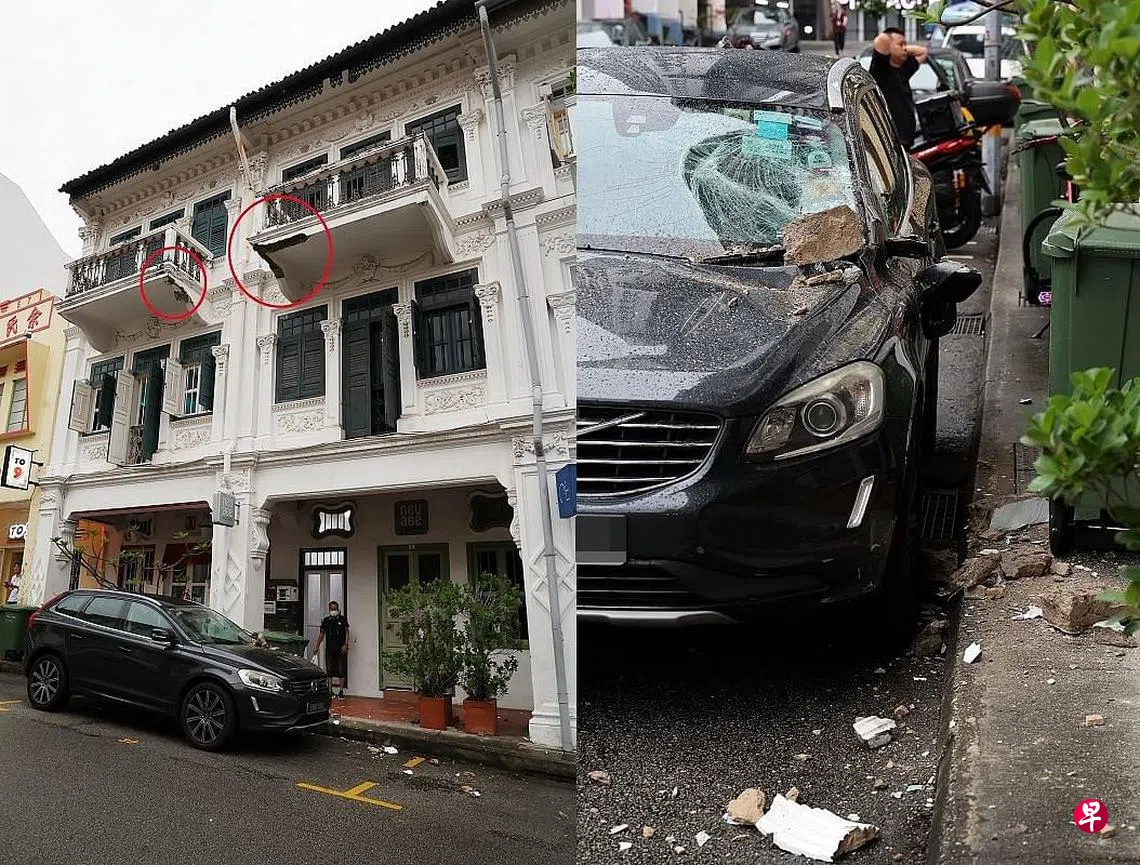 疑植物根茎入侵阳台导致石灰脱落,牛车水一店屋的三楼阳台石灰剥落砸下,砸中停在路旁的汽车,惊动警方封锁现场。