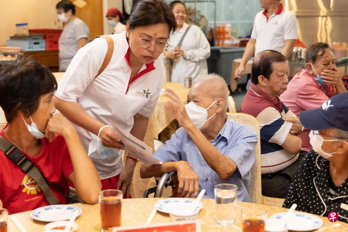 振瑞路百多名租赁组屋老人星期天(1月29日)早上,在“让希望活下去”(Keeping Hope Alive)义工带领下,到红星酒家“捞起”庆新年。该组织发起人潘迎芬和约20名义工借这个机会给老人讲解,如何领取及使用社理会邻里购物券,以及该注意的事项。
