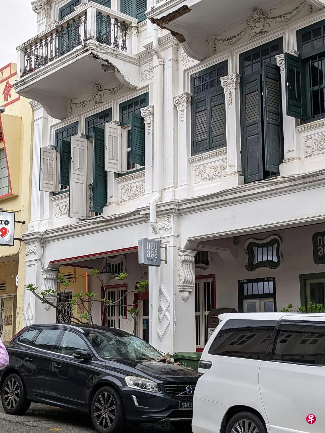 牛车水会馆街店屋的三楼阳台石灰剥落,砸中停在路旁的轿车,警方到场封锁受影响区域,确保公众安全。
