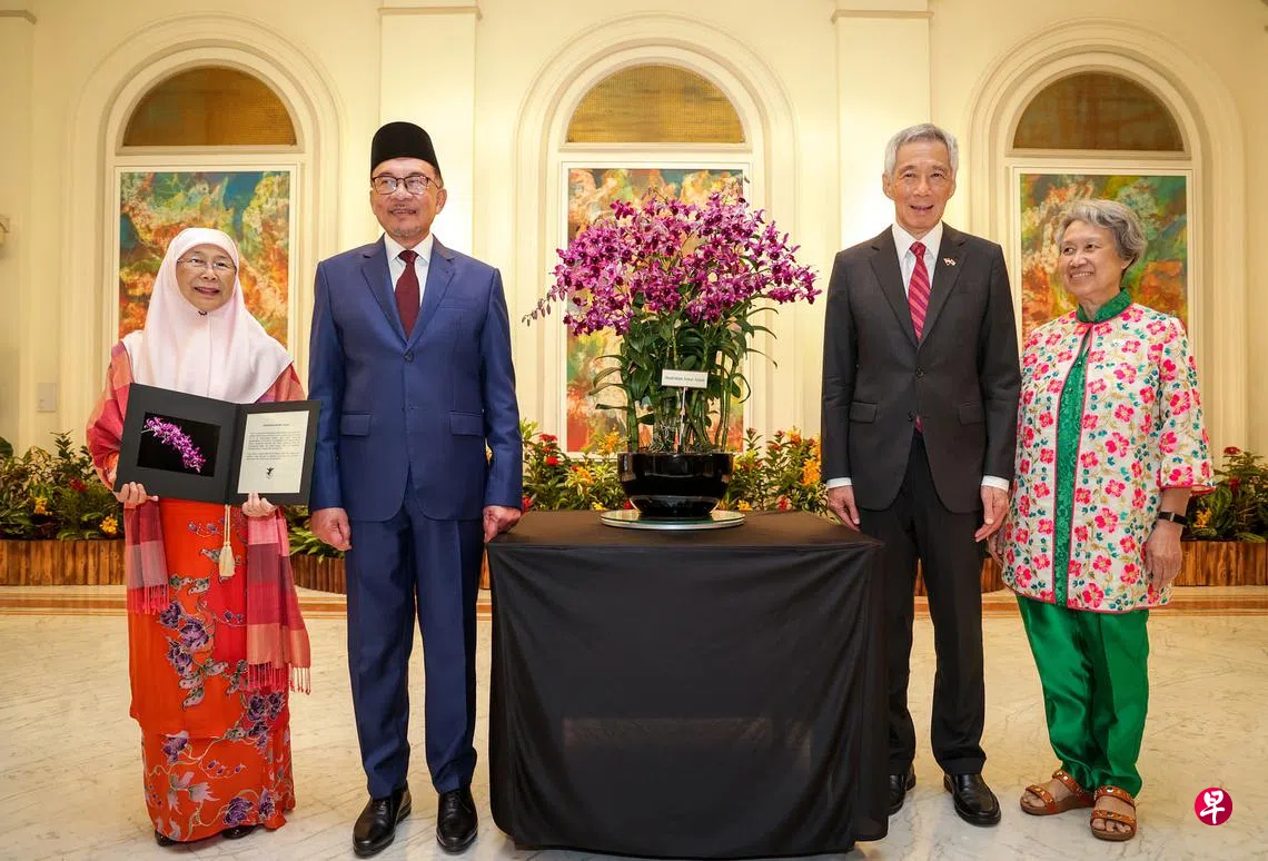 到访我国的马来西亚首相安华(左二)和夫人旺阿兹莎(左一)星期一(1月30日)在总统府出席胡姬花命名仪式,